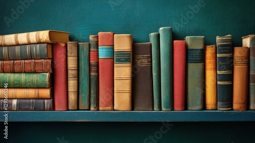 © Diffin, Naklejka premium A vibrant shelf filled with books, set against a striking green wall and a contrasting blue wall, creating a lively reading space.
