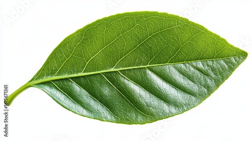 Fototapeta premium A vibrant, single, green leaf with prominent veins, isolated on a white background. Detailed texture visible
