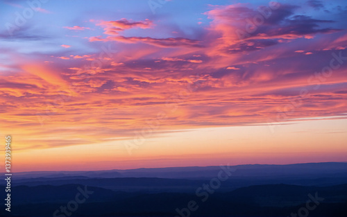 Obraz premium A vibrant sky ablaze with colors at dusk or dawn, showcasing hues of pink, orange, and blue. Clouds are painted with light above a dark silhouette of distant mountains at the horizon.