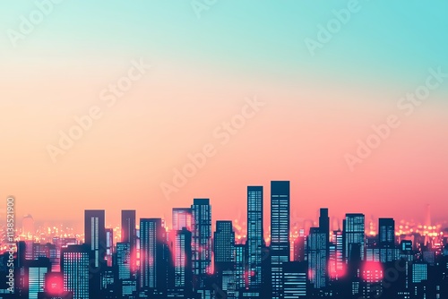 Fototapeta premium A vibrant skyline at dusk with colorful lights illuminating modern buildings.