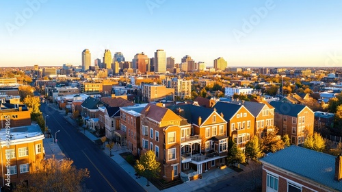 Naklejka premium A vibrant skyline of a city at sunset, showcasing modern architecture alongside charming residential homes in the foreground.