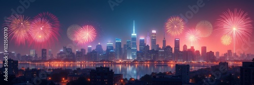 Fototapeta premium A vibrant skyline of a city illuminated by colorful fireworks, capturing the essence of celebration and urban energy, perfect for event promotions and festive themes.