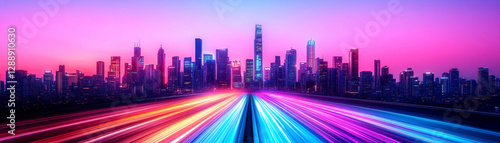 © Fareedoh, Fototapeta premium A vibrant skyline view at dusk with bright colors illuminating the cityscape.