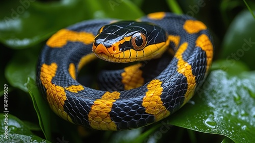 © artzone, Obraz premium A vibrant snake coiled among lush green leaves.