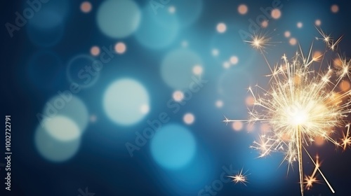 © Iona, Obraz premium A vibrant sparkler burns brightly against a backdrop of soft, blue bokeh lights, creating a festive and celebratory atmosphere.