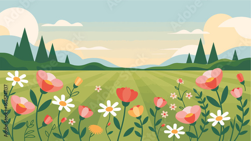 Fototapeta premium A Vibrant Spring Meadow Bursting with Colorful Flowers and Lush Greenery Under a Serene Sky