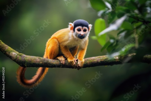 © KumCup, Fototapeta premium A vibrant squirrel monkey perched on a branch in a lush, green forest setting.