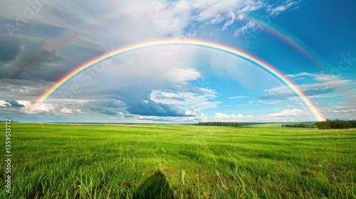 © Chandara, Naklejka premium A vibrant St. Patrick's Day rainbow arching over a green field.