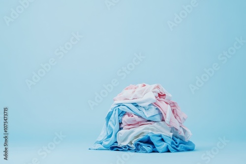Obraz premium A vibrant still life piece depicting a crumpled mass of laundry set against a serene blue backdrop, showcasing the chaos inherent in the everyday cleaning chores we all face in our busy lives