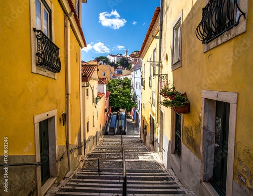 © garaga, Fototapeta premium A vibrant street scene with steps leading upwards between colorful buildings