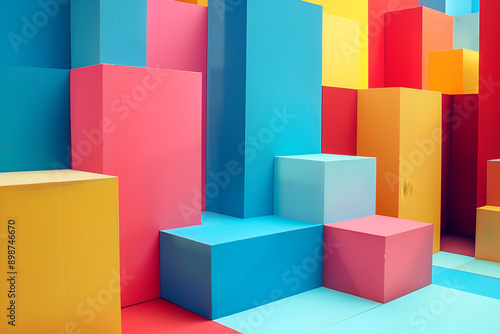 © Varun, Obraz premium A vibrant striped wall in a modern urban setting with a long bench, showcasing bold colors and geometric patterns.