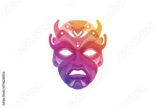 Naklejka premium A vibrant, stylized illustration of a colorful, geometric tribal mask against white background.