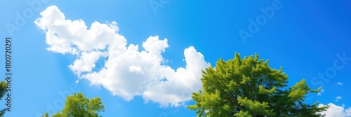 © Nasnunt, Obraz premium A vibrant summer background featuring a clear blue sky, soft fluffy clouds, and lush green trees, clouds, sunny