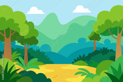 © RADHA RANI, Fototapeta premium A vibrant summer nature landscape with green trees, hills, and mountains under a clear sky