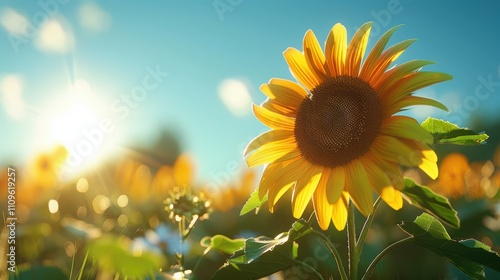 Fototapeta premium A vibrant sunflower basking in sunlight amidst a field of blooms.