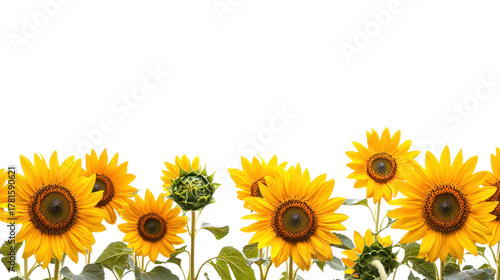 © Von, Fototapeta premium A vibrant sunflower field with yellow flowers and green leaves against a white background.