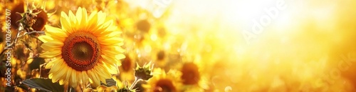 © BerkahStock, Fototapeta premium A vibrant sunflower in a golden field, illuminated by warm sunlight.