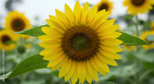 Fototapeta premium A vibrant sunflower in full bloom, surrounded by green leaves and a blurred field of sunflowers.