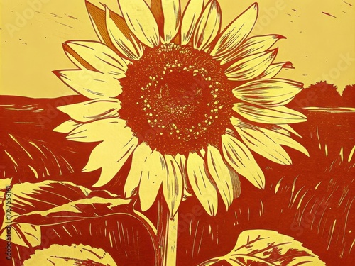 © sevlani, Fototapeta premium A vibrant sunflower stands tall against a golden sky, symbolizing summer’s warmth and the beauty of nature's blooms. Generative AI