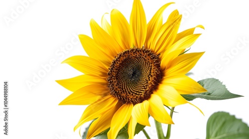 Fototapeta premium A vibrant sunflower with bright yellow petals and a rich brown center, symbolizing warmth and cheerfulness against a light background.