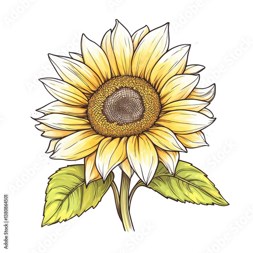 Fototapeta premium A vibrant sunflower with large, yellow petals and a textured center, accompanied by green leaves, showcasing its natural beauty.