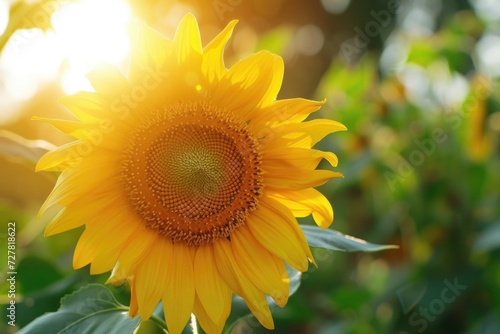 Fototapeta premium A vibrant sunflower with the sun shining behind it. Perfect for nature and...