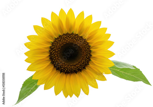 © Sarwar, Fototapeta premium A vibrant sunflower with yellow petals and a dark brown center on a white background with green leaves