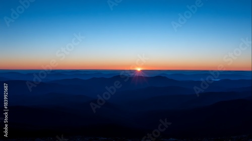 © Vidio, Fototapeta premium A vibrant sunrise emerges, casting light over layered mountain ranges against a gradient sky