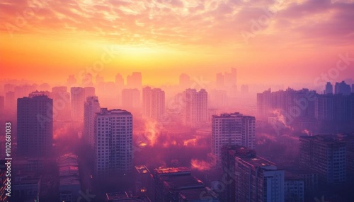 Fototapeta premium A vibrant sunrise over a city skyline shrouded in mist.
