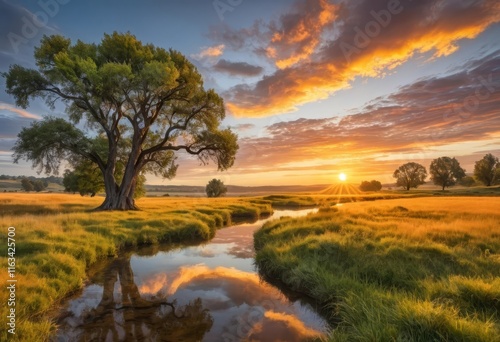 © Iqra, Obraz premium A vibrant sunrise over a landscape with trees, grasslands, and a body of water