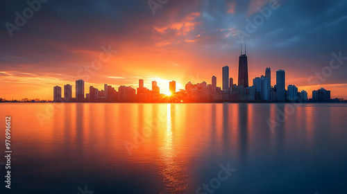 Fototapeta premium A vibrant sunrise over a modern city skyline, casting an orange glow on the water.