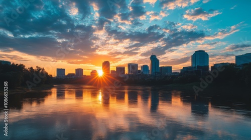 Naklejka premium A vibrant sunset casts a warm glow over a city skyline reflected in a calm...
