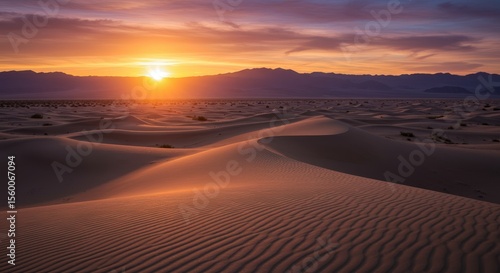 © Liton Khan, Fototapeta premium A vibrant sunset casts golden light over rolling sand dunes and distant mountains