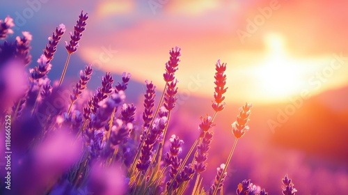 Naklejka premium A vibrant sunset casts warm hues over blooming lavender fields, creating a...