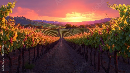 Naklejka premium A vibrant sunset casts warm hues over lush vineyards, creating a serene...