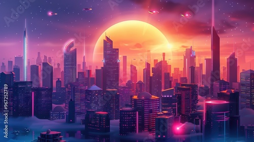 Fototapeta premium A vibrant sunset cityscape showcasing futuristic skyscrapers and flying...