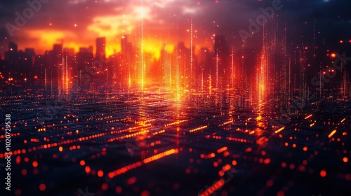 © Panuwat, Fototapeta premium A vibrant sunset illuminates a city skyline, with shimmering reflections and dynamic light patterns creating a mystical atmosphere.