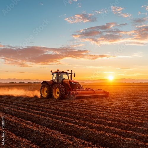 Fototapeta premium A vibrant sunset illuminates a tractor working on freshly plowed soil,...