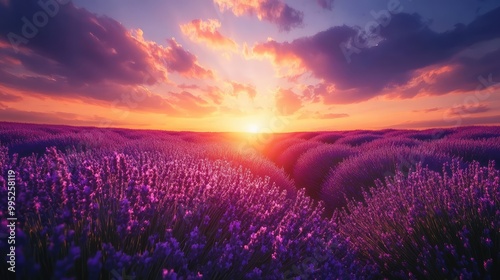 Fototapeta premium A vibrant sunset illuminating a field of lavender