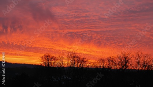 © vxnaghiyev, Fototapeta premium A vibrant sunset illuminating treetops, showcasing seasonal change