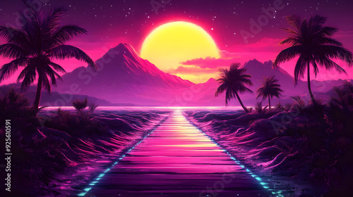 © Siasart Studio, Fototapeta premium A vibrant sunset landscape with palm trees and a reflective pathway.