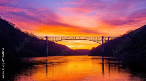 Fototapeta premium A vibrant sunset over a bridge reflecting on a river, showcasing natural...