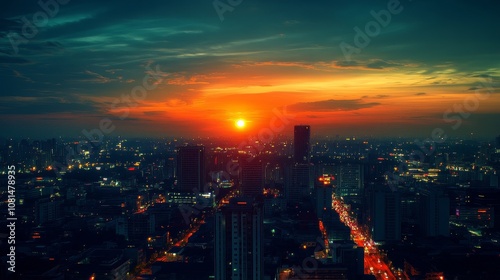 Fototapeta premium A vibrant sunset over a bustling cityscape, highlighting urban life and...