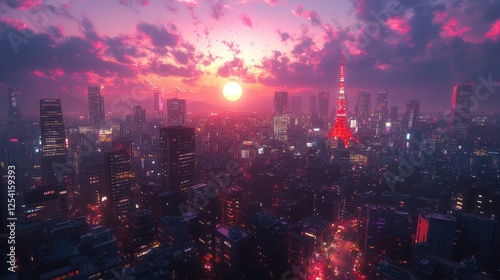 © Stockfish, Fototapeta premium A vibrant sunset over a city skyline featuring tall buildings and a prominent tower.