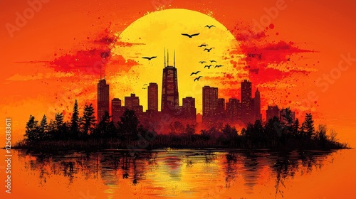 Fototapeta premium A vibrant sunset over a city skyline reflected in water, with birds flying.
