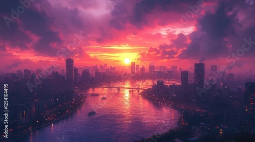 Naklejka premium A vibrant sunset over a city skyline reflecting on a river, creating a serene...