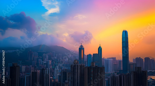 Fototapeta premium A vibrant sunset over a city skyline, showcasing modern architecture and...