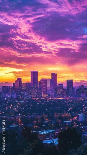 Fototapeta premium A vibrant sunset over a city skyline, showcasing urban beauty.