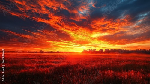 © Farhan, Fototapeta premium A vibrant sunset over a field with orange and dark clouds creating a dramatic and colorful landscape view