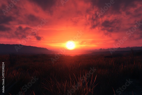 Fototapeta premium A vibrant sunset over a grassy landscape, casting warm hues across the sky.